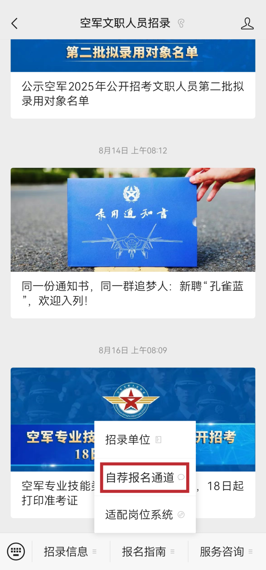 可通过“空军文职东说念主员招录”微信公众号,点击底部菜单【报名指南】-【自荐报名通说念】,在线填写并提交《空军高等次文职东说念主员招聘自荐报名表》,即可完成报名。