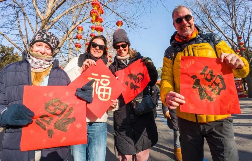 1月29日,北京天坛公园,番邦旅客手拿“福”字合影迷恋。今日,天坛春节游园会开幕,旅客一站式体验诸多非遗技俩,感受浓浓的年味。孙立君摄(中经视觉)