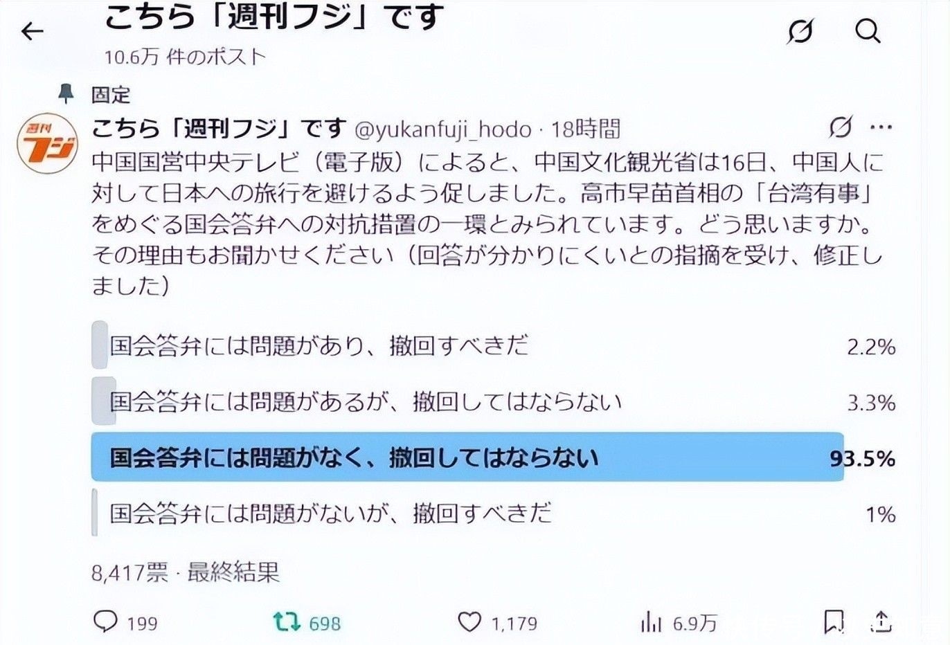 5. 据日本某盛名周刊透露,他们在本月17日至18日历间,对世界边界内随即抽取的8417名寰球进行了问卷看望。效果透露,高达93.5%的受访者觉得高市早苗的涉华表态并无欠妥,不应畏惧关系言论。