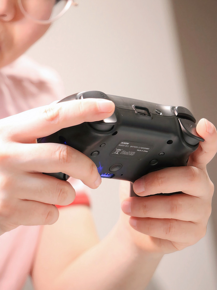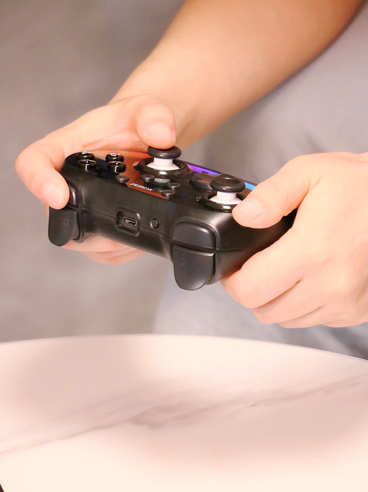 还有L/R扳机键,手感很绝!扣动的期间有阻力,能模拟枪械击发的反冲力,玩赛车游戏踩刹车也有着实的阻尼感,不是那种迟滞的“按一下”,千里浸感平直拉满。
