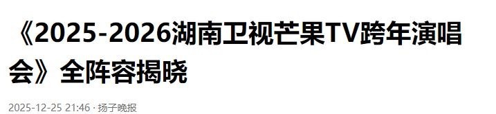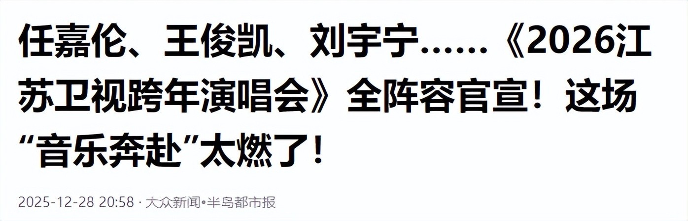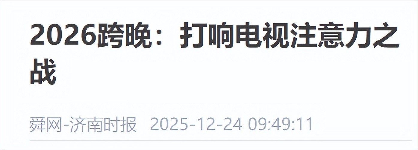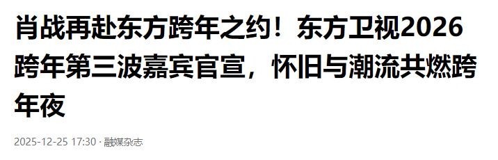 参考文件:1.舜网-济南时报:《2026跨晚:打响电视细心力之战》2025-12-242.融媒杂志:《肖战再赴东方跨年之约!东方卫视2026跨年第三波嘉宾官宣,怀旧与潮水共燃跨大除夜》2025-12-253.内行新闻·半岛都市报:《任嘉伦、王俊凯、刘宇宁……<<2026江苏卫视跨年演唱会>>全威望官宣!这场奔赴”太燃了!》2025-12-284.扬子晚报:《<<2025-2026湖南卫视芒果TV跨年演唱会>>全威望揭晓》2025-12-25