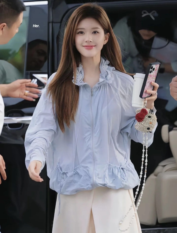第一套:她穿的是浅蓝底色、带淡斑纹的新登科宽松上衣,版型是oversize的汉服元素款,面料是鄙俚的雪纺类材质,搭配同色系内搭下装。死后是职责主谈主员,应该是片场路透,这种宽松款把新登科的松弛感拉满。