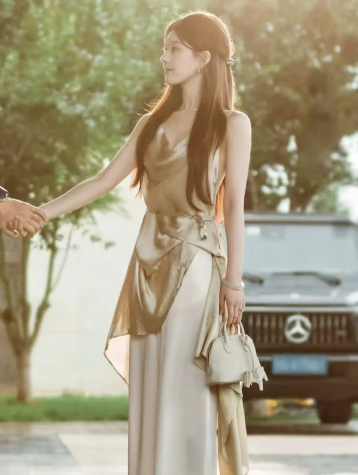 这条缎面吊带裙,心理是和缓的浅香槟色,料子自带甘心感,显得特殊高档有质感,然后裙子的蓄意是不合称的褶皱款,还系了条同色系腰带,既能把腰掐得很细,何况还很显体格。