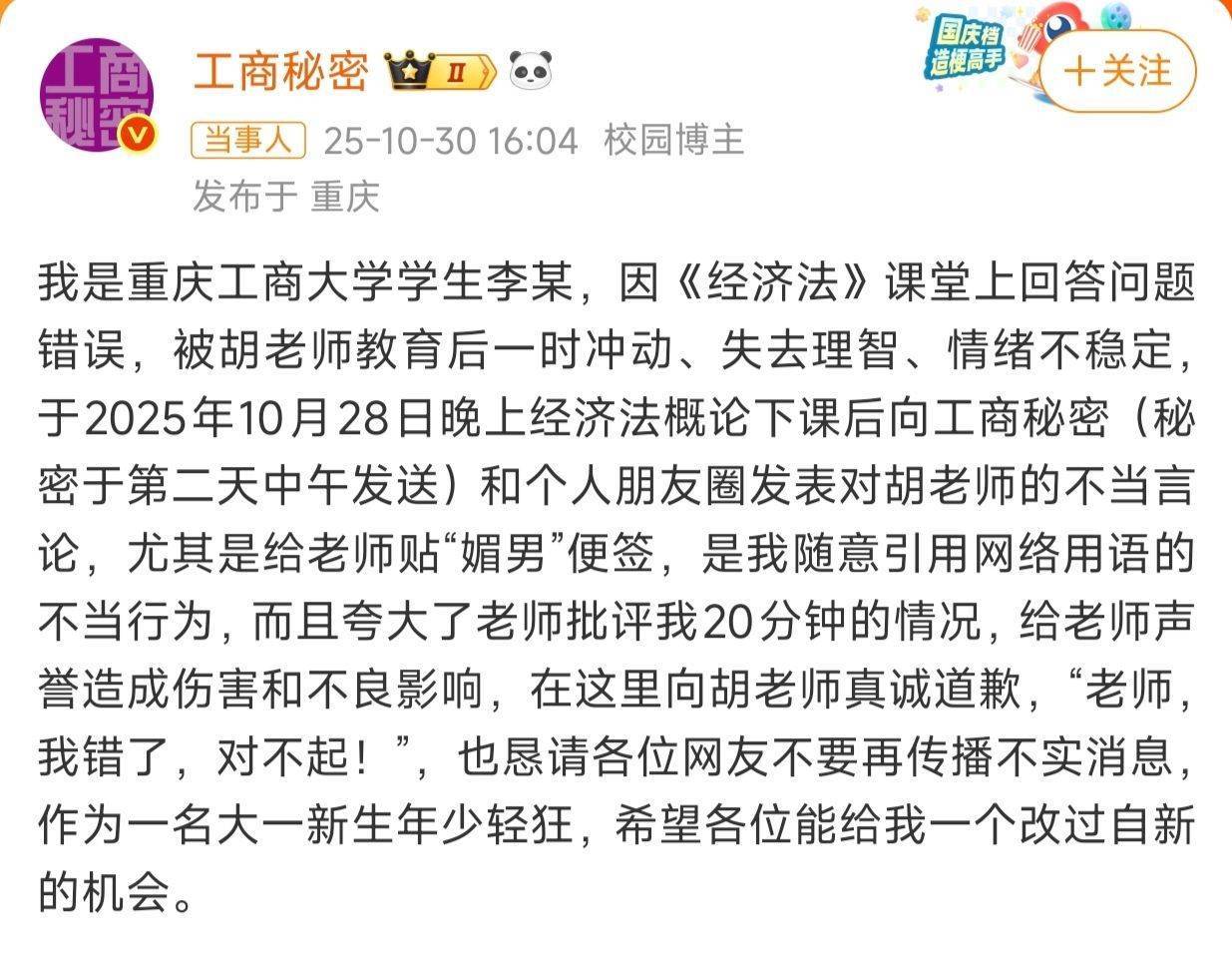随后,涉事学生现身并说念歉,称我方因在《经济法》课堂上回答问题无理,被胡真挚批评后一时冲动、失去缄默、感情不厚实,于是在网上发表了对胡真挚的不当言论,并夸大测度情况。该校党委宣传部使命主说念主员称,学校真挚也曾知说念此事,现在正在处理应中。