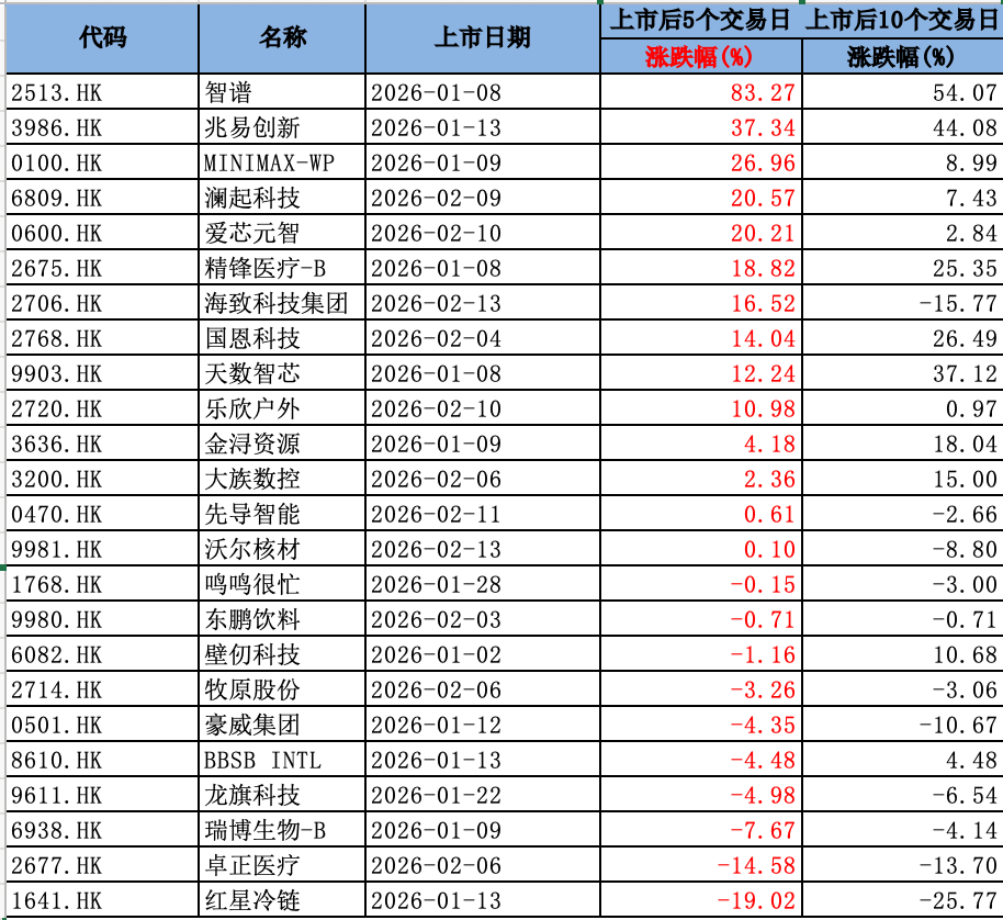 拉永劫分维度,2026年以来港股IPO市集呈现权臣的“冰火两重天”款式。Wind数据骄气,年内上市的27只新股中,仅上述2只在上市首日破发。不外,若不雅察上市后5个往将来阐扬,跌破刊行价的个股扩大至10只,其中红星冷链下落19.02%,卓正医疗下落14.58%。与此同期,以AI主见股为代表的“新贵”则涨势凌厉:智谱、兆易改进、MINIMAX-WP在上市后5个往将来内远离飙升83.27%、37.34%和26.96%。