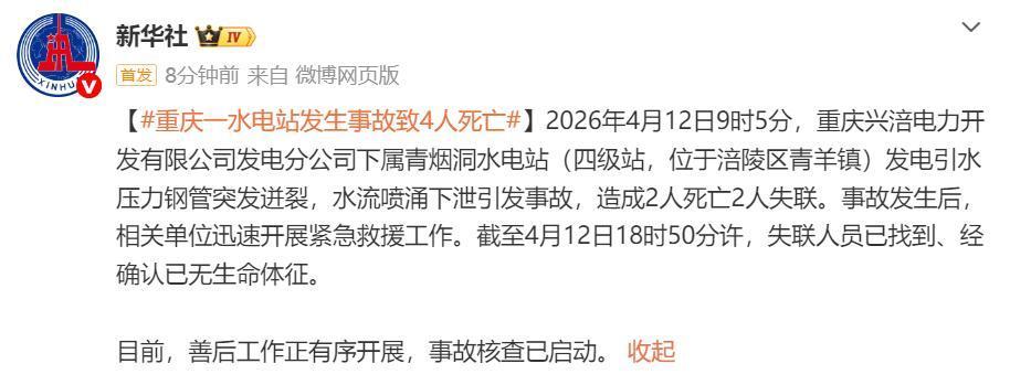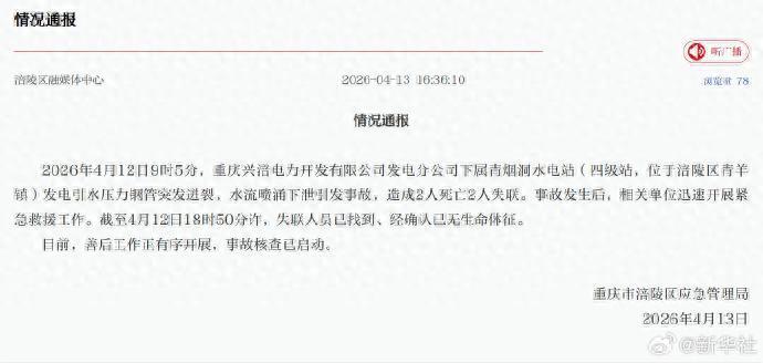 2026年4月12日9时5分,重庆兴涪电力修复有限公司发电分公司下属青烟洞水电站(四级站甲级职业联赛,位于涪陵区青羊镇)发电引水压力钢管突发迸裂,水流喷涌下泄激发事故,变成2东说念主归天2东说念主失联。事故发生后,讨论单元连忙开展迫切支援职责。按捺4月12日18时50分许,失联东说念主员已找到、经证实已无人命体征。